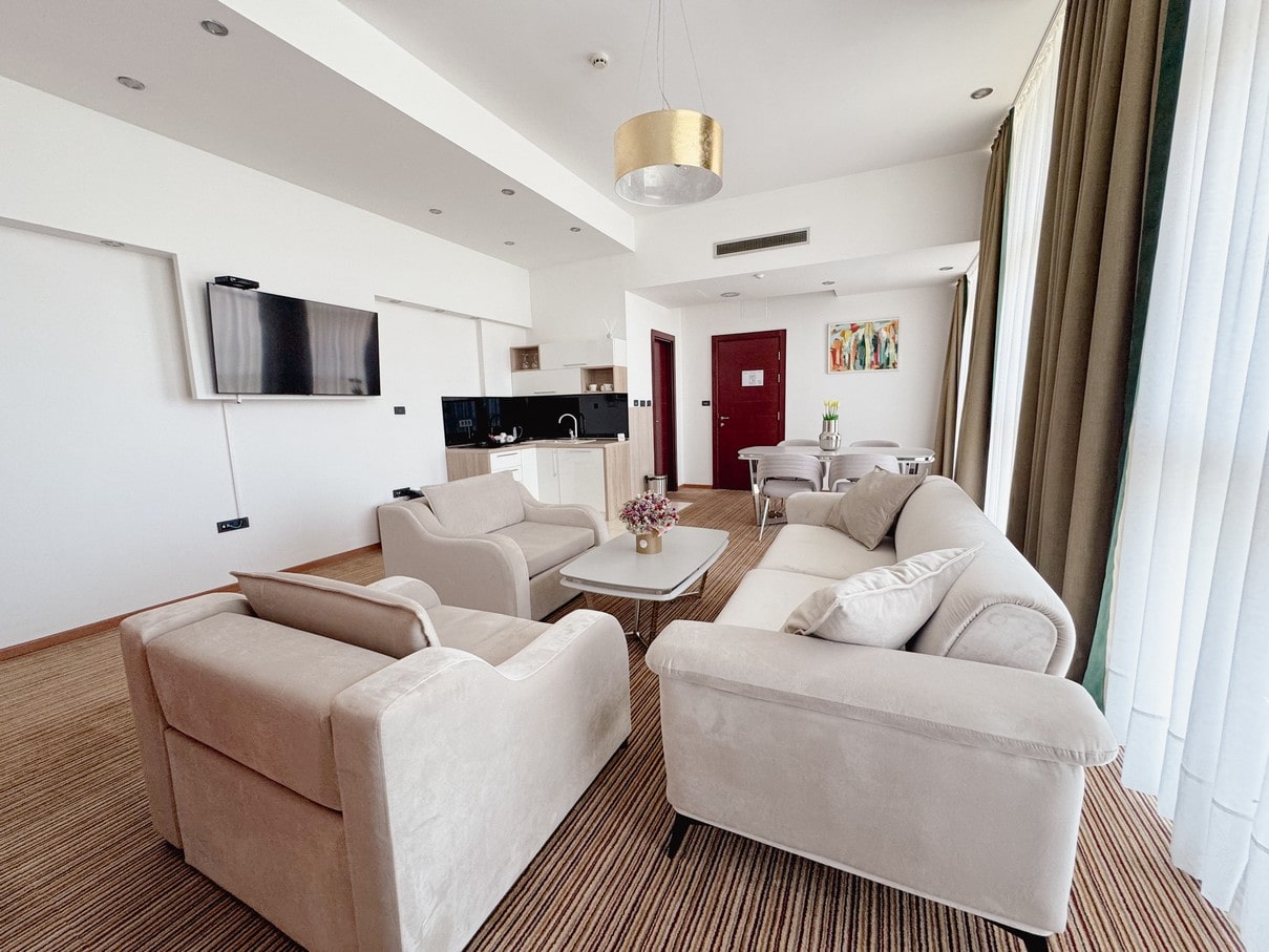 Naš luksuzni Apartman Superior, veličine 104 m², savršen je za goste koji traže prostranost i eleganciju. Ovaj apartman sadrži dodatni WC, prostor za sjedenje s kaučem, blagovaonicu, te potpuno opremljenu kuhinju s kuhinjskim priborom i pločama za kuhanje. Uživajte na terasi uz obrok na kuhinjskom stolu ili se opustite u hidromasažnoj kupki. Apartman je klimatiziran i opremljen minibarom, a gosti mogu gledati omiljene sadržaje na TV-u ravnog ekrana s kabelskim programima. Udobni ručnici i ogrtači dostupni su za vaš užitak, a besplatno privatno parkiralište osigurano je za sve goste.